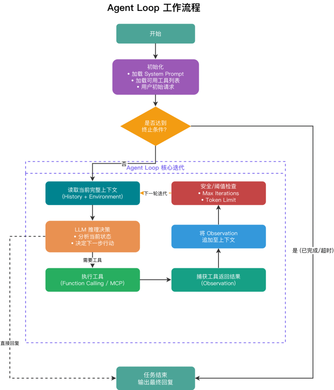 循环迭代(核心):读取当前完整上下文 → LLM 推理决定下一步行动(调用工具 or 直接回复)→ 触发并执行对应工具 → 捕获工具返回结果(Observation)→ 将 Observation 追加至上下文。