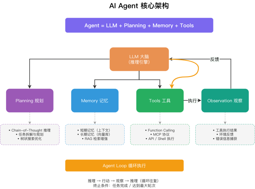 核心公式:Agent = LLM + Planning(规划)+ Memory(记忆)+ Tools(工具)