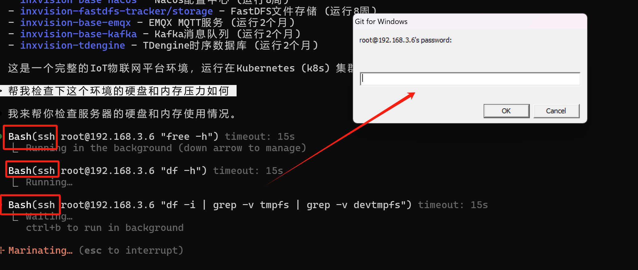 这是一个任务项目,不需要开发任何代码,任务是帮我排查线上环境问题 具体描述见 @/README.md 这次比前面顺利多了,直接就打开终端等我输入密码,输入密码后就开始各种工作,我呢为了防止他乱来,就一直盯着它工作就了行了