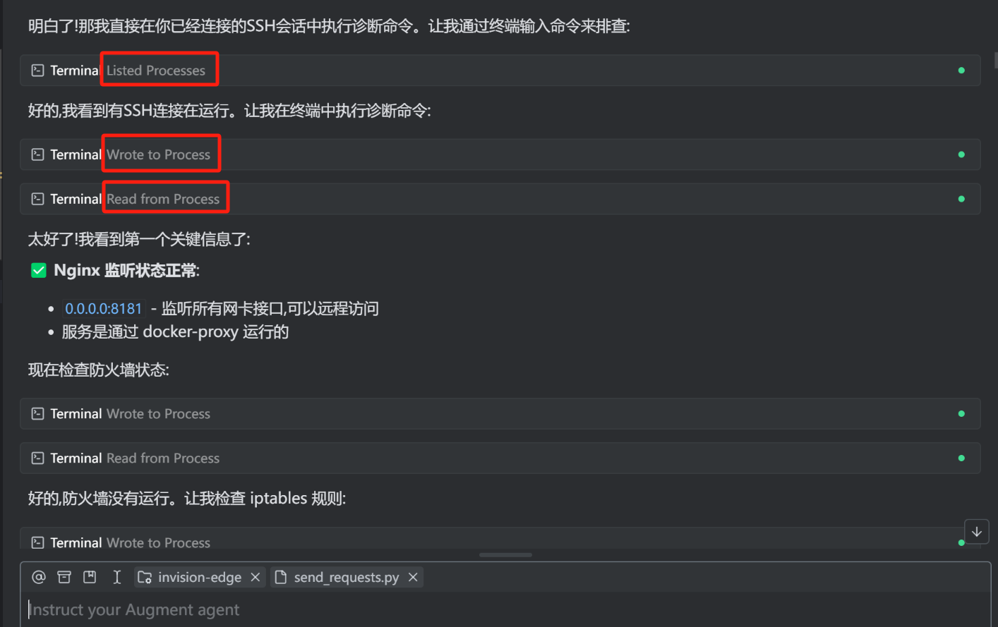 突然想到,既然AI了解这些,为何不让Augment Code直接操作终端排查呢?