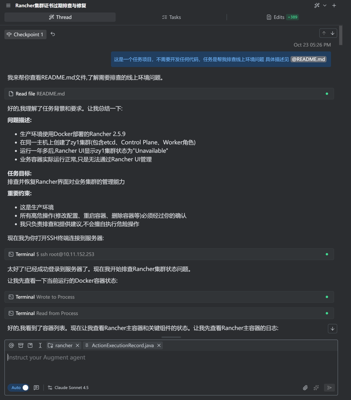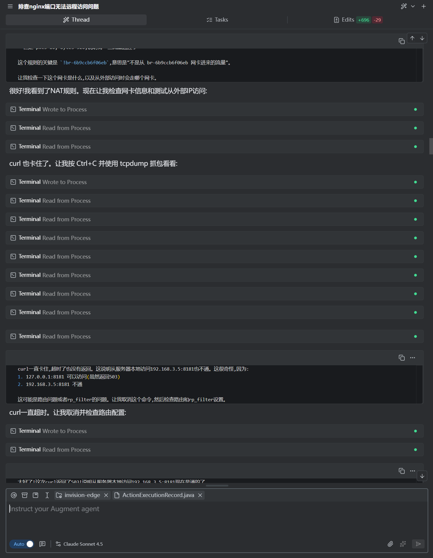 然后,我就喝着茶,看着Augment操作服务器,像看着大佬在排查问题一样,同时也能学习到它是怎么解决问题: