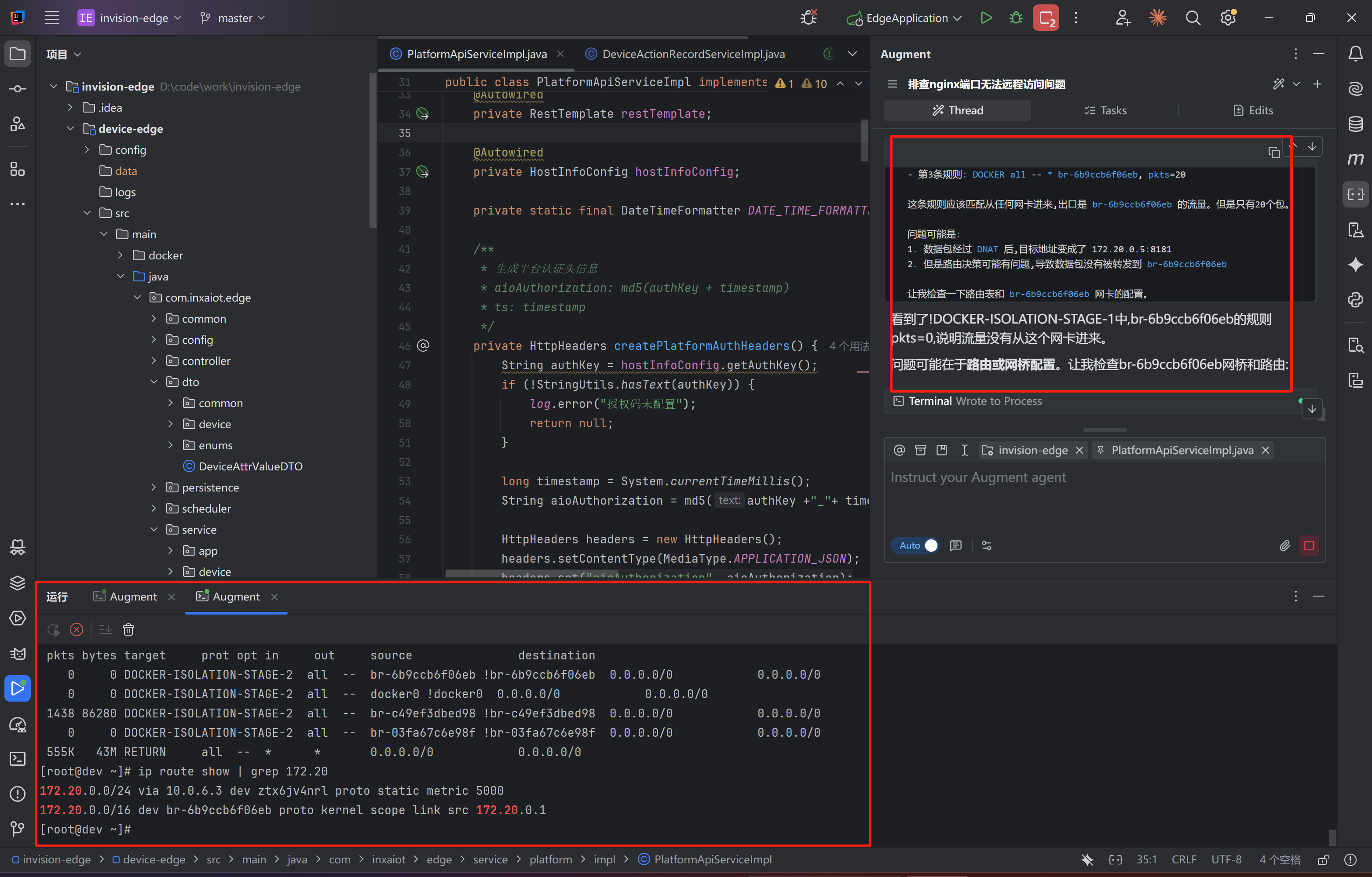 请求你直接启动终端远程连接上服务器运行命令排查,ssh root@192.168.3.5,由我输入密码这会儿,Augment按预期开始工作了,在IDE里打开了终端,并输入了ssh root@192.168.3.5,等待我输入密码,我输入密码后然后就开始工作了