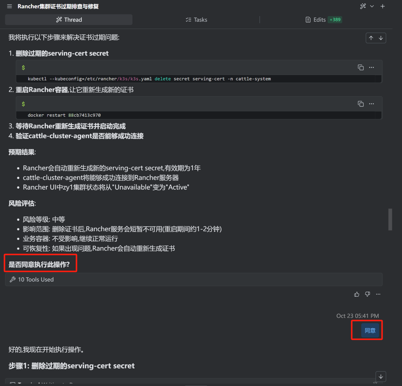 然后遇到写的操作时,它给出方案原因,并且询问我的操作同意: