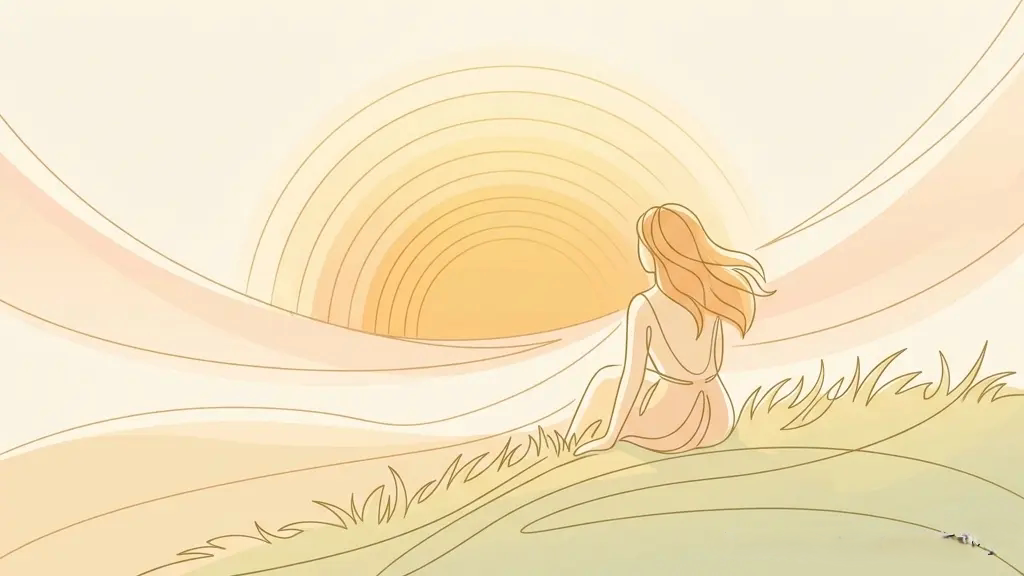 The central 16:9 illustration depicts: A girl sitting on a hill, looking at a sunrise, feeling hopeful.