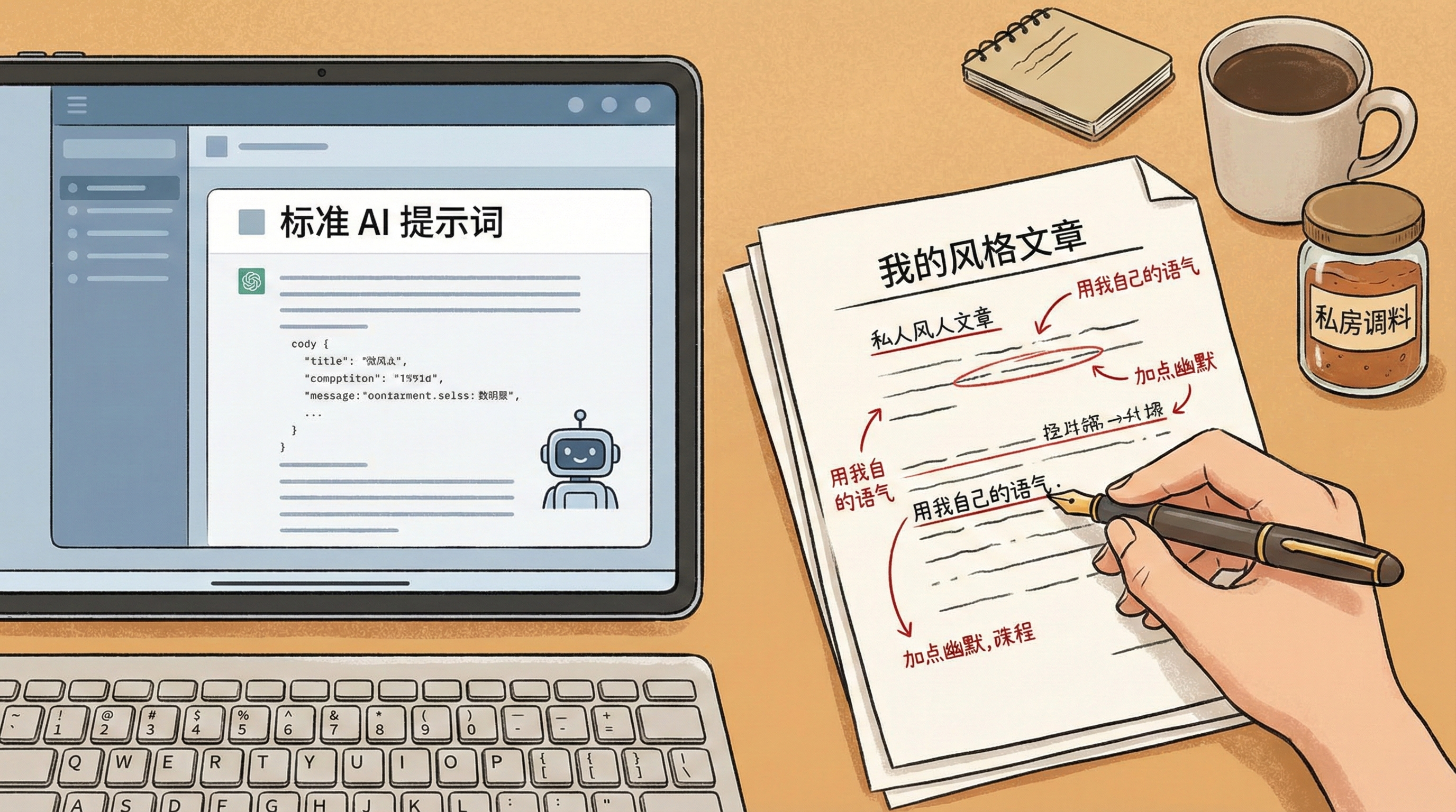 AI 的平均风格就像食堂大锅菜,营养够,能吃饱,但没人会说“这是我最爱的那道菜”。提示词像你跟食堂师傅喊了一嗓子“少放盐”,他这顿少放了,下顿又忘了。