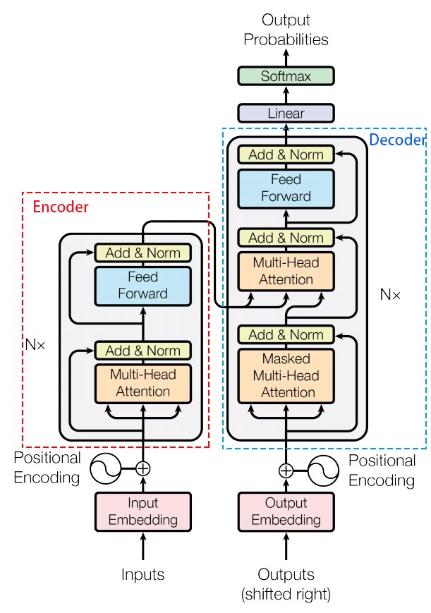 2017年Google在论文《Attention is All You Need》中提出 Transformer架构。这是一种基于自注意力机制(self-attention mechanism)的神经网络架构,它通过将序列中所有位置的信息进行交互,来处理长序列。Transformer将输入序列分别传递给编码器和解器,每个部分由多个层次组成,每个层次由多头自注意力机制和全连接层组成。Transformer的编码器和解码器可以同时处理多个序列位置,因此可以更高效地处理长序列。下图是这篇论文提到的网络示意图: