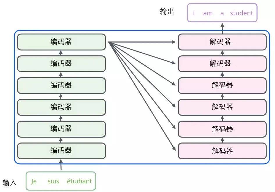 编码组件部分由一堆编码器(encoder)构成(论文中是将6个编码器叠在一起——数字6没有什么神奇之处,你也可以尝试其他数字)。解码组件部分也是由相同数量(与编码器对应)的解码器(decoder)组成的。