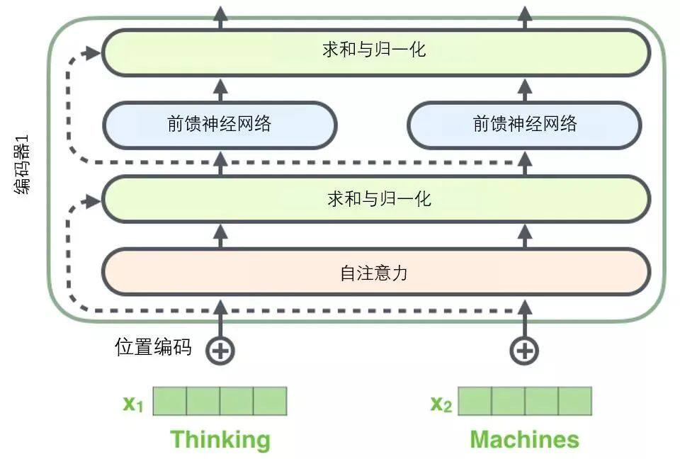 将输入序列进行词嵌入之后,每个单词都会流经编码器中的两个子层。