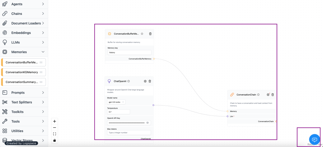 CMD ["langflow", "--host", "0.0.0.0", "--port", "7860"]在界面上配置LangChain的三个组件:在最右下角是对应的聊天窗口,输入下openai的key。